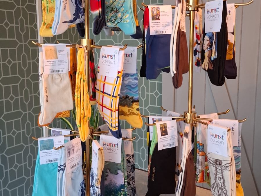 Vrolijke gekleurde sokken met afbeeldingen van oa Oude Meesters, zoals het Meisje met de Parel. Naadloos en ook geschikt bij diabetes.